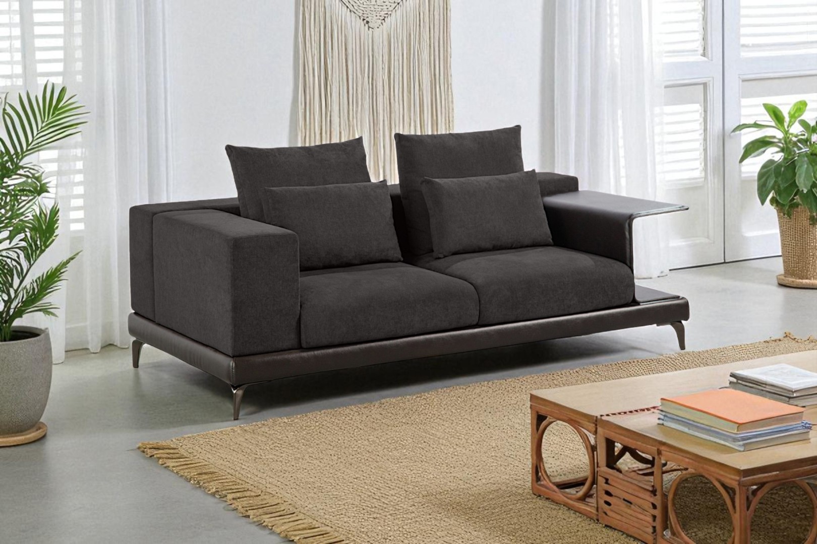 Диван обит тканью со всех сторон, что позволяет использовать данную модель для зонирования пространства в жилом помещении.