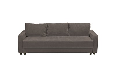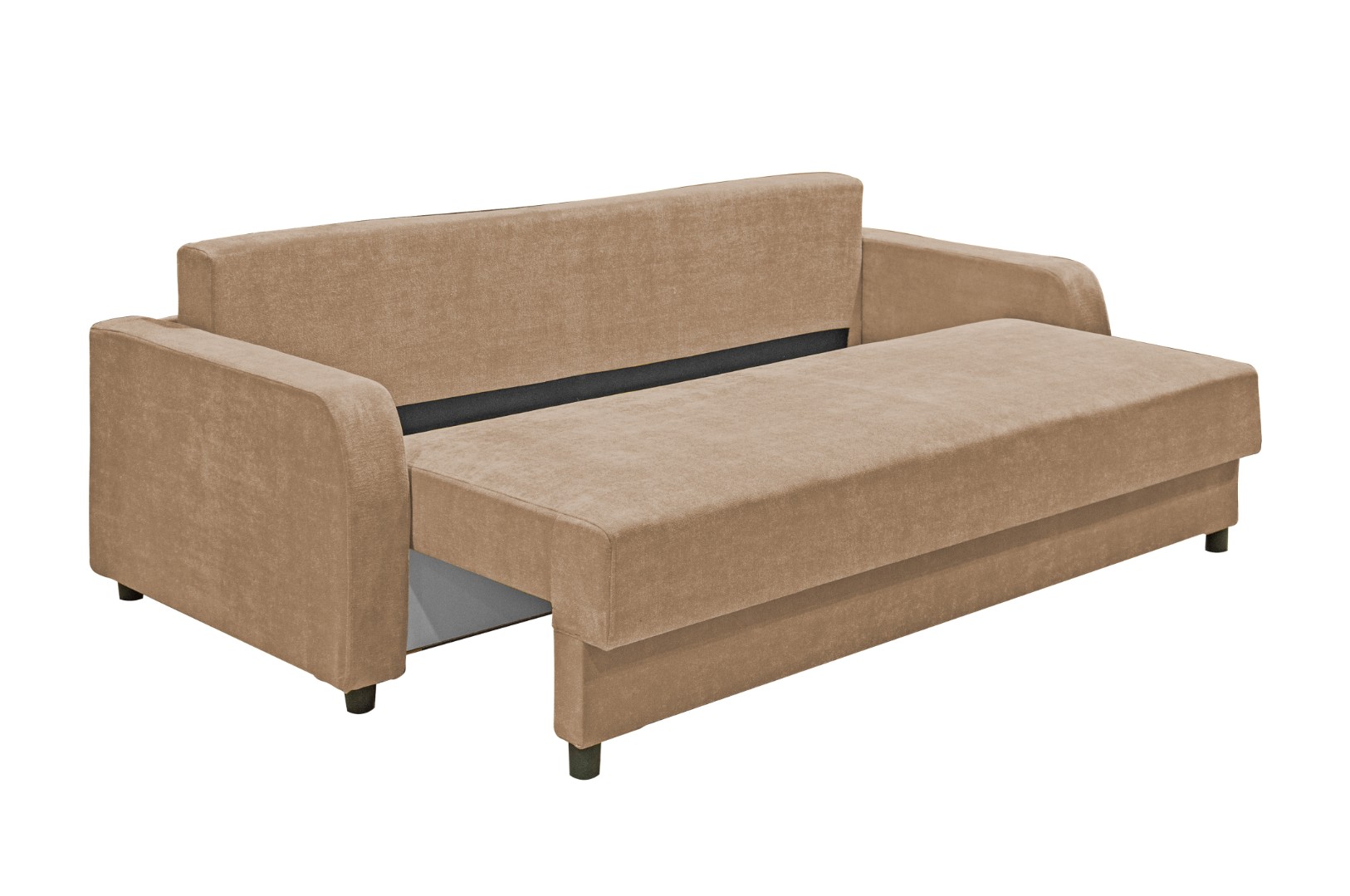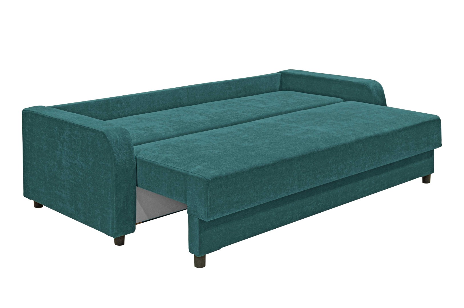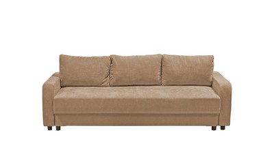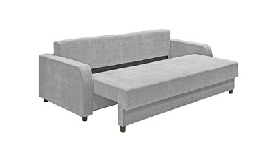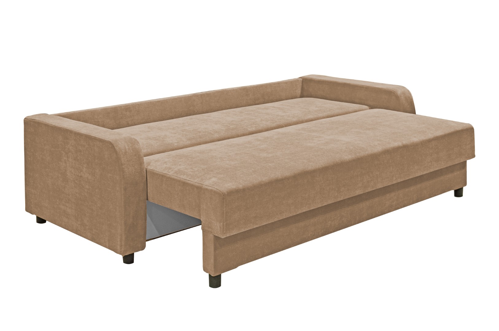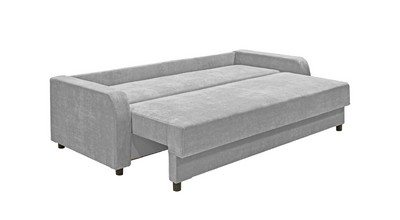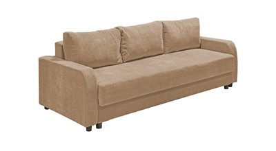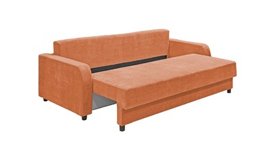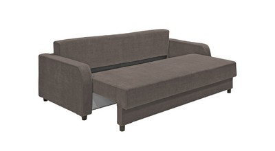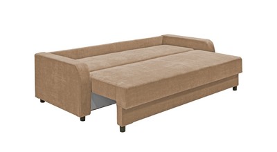 Мебель, изготовленная с применением такого механизма, имеет несколько достоинств: во-первых, можно варьировать размерами изделия, во-вторых, за счет использования недорогих комплектующих (роликов, петель), мебель относительно дешевая и доступна для покупателя. Подобный диван можно поставить вплотную к стене, в нём всегда есть вместительный бельевой ящик. Повышенная вместительность бельевого ящика обусловлена тем, что он занимает все пространство под сиденьем дивана. Недостатками является невозможность сделать спинку анатомической, но данная проблема решается за счет подушек, набитых синтетическим пухом, и то, что сиденье при выдвижении «ездит» по полу, поэтому будьте бдительны, владельцы дорогих паркетов и пушистых ковров. В разложенном виде подобные диваны достаточно громоздкие. Однако даже в этом минусе есть плюс – ведь вы получаете полноценное, максимально просторное спальное место.