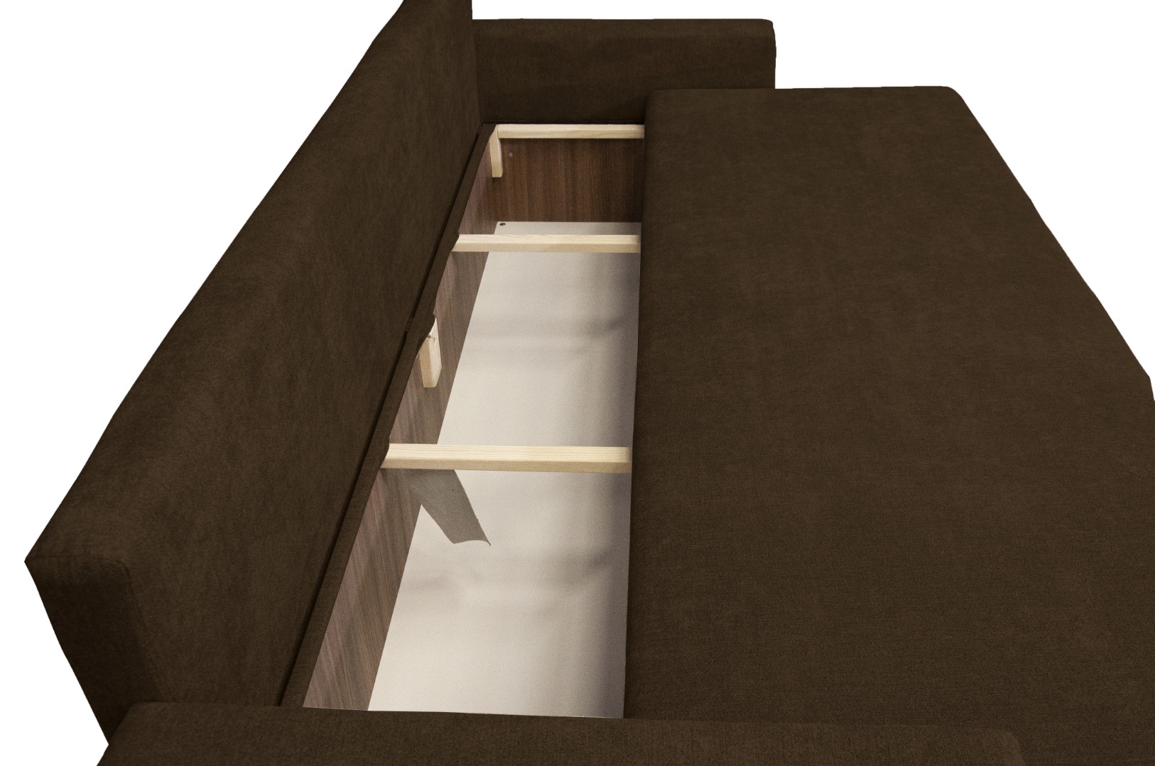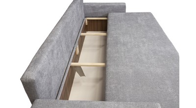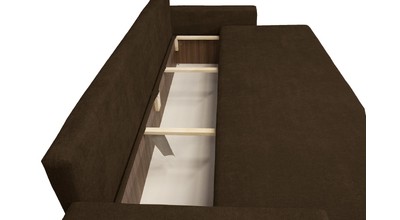 Прочность каркаса обеспечивает использование сухого бруса хвойных пород и ДСП. Имеет вместительный ящик для хранения постельных принадлежностей.