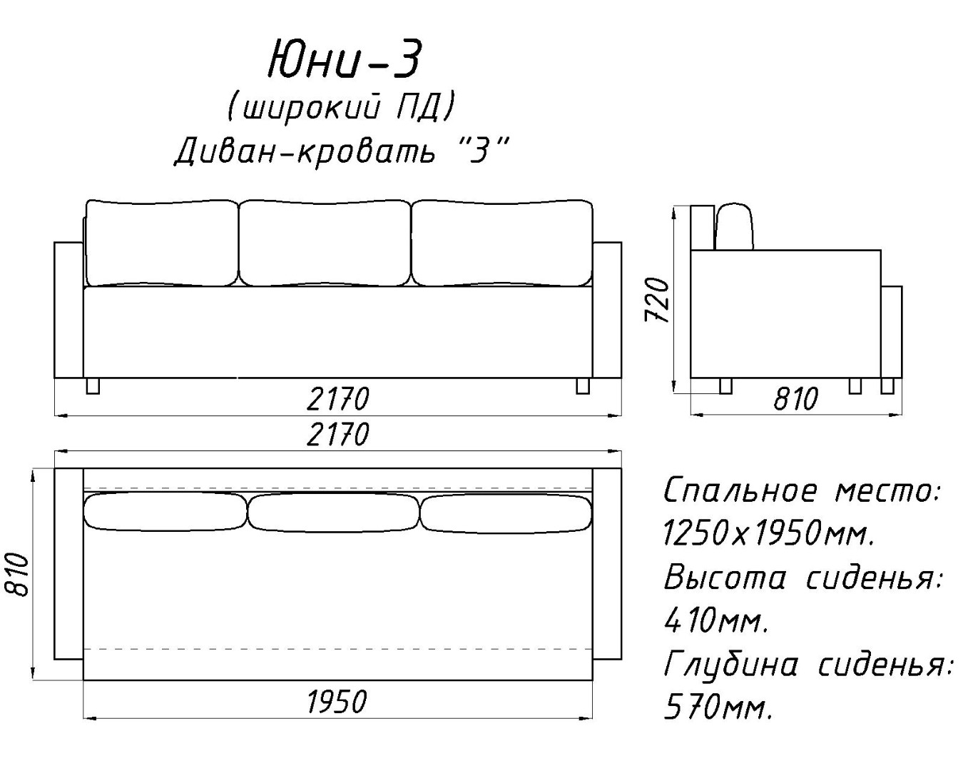 «Юни» трехместный диван-кровать с широкими подлокотниками