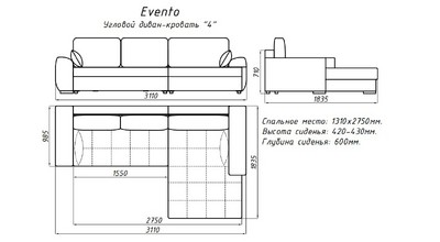 Диван-кровать «Evento» настолько большой и комфортабельный, что позволяет принять удобное положение как сидя, так и лёжа, даже не убирая подушки. Угловая часть имеет достаточно большие размеры по ширине и длине, что позволяет удобно разместиться на ней как в положении полусидя, так и лёжа.