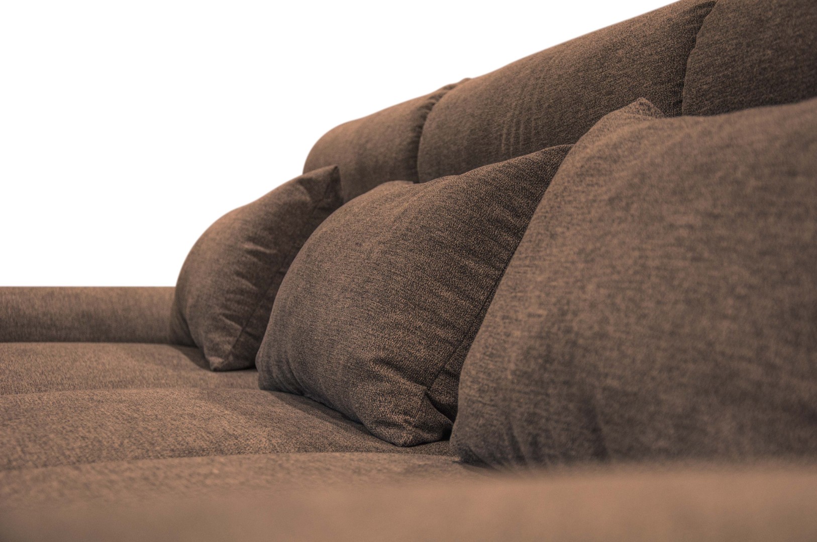 Для обивки можно использовать различные по фактуре и цветовой гамме обивочные ткани: как плотные шениллы, так и мягкие флоки. Диван обит тканью со всех сторон, что позволяет использовать данную модель для зонирования пространства в жилом помещении.