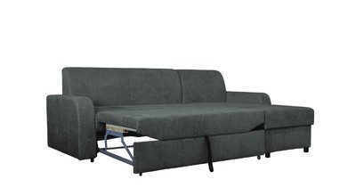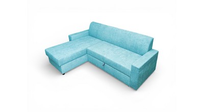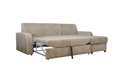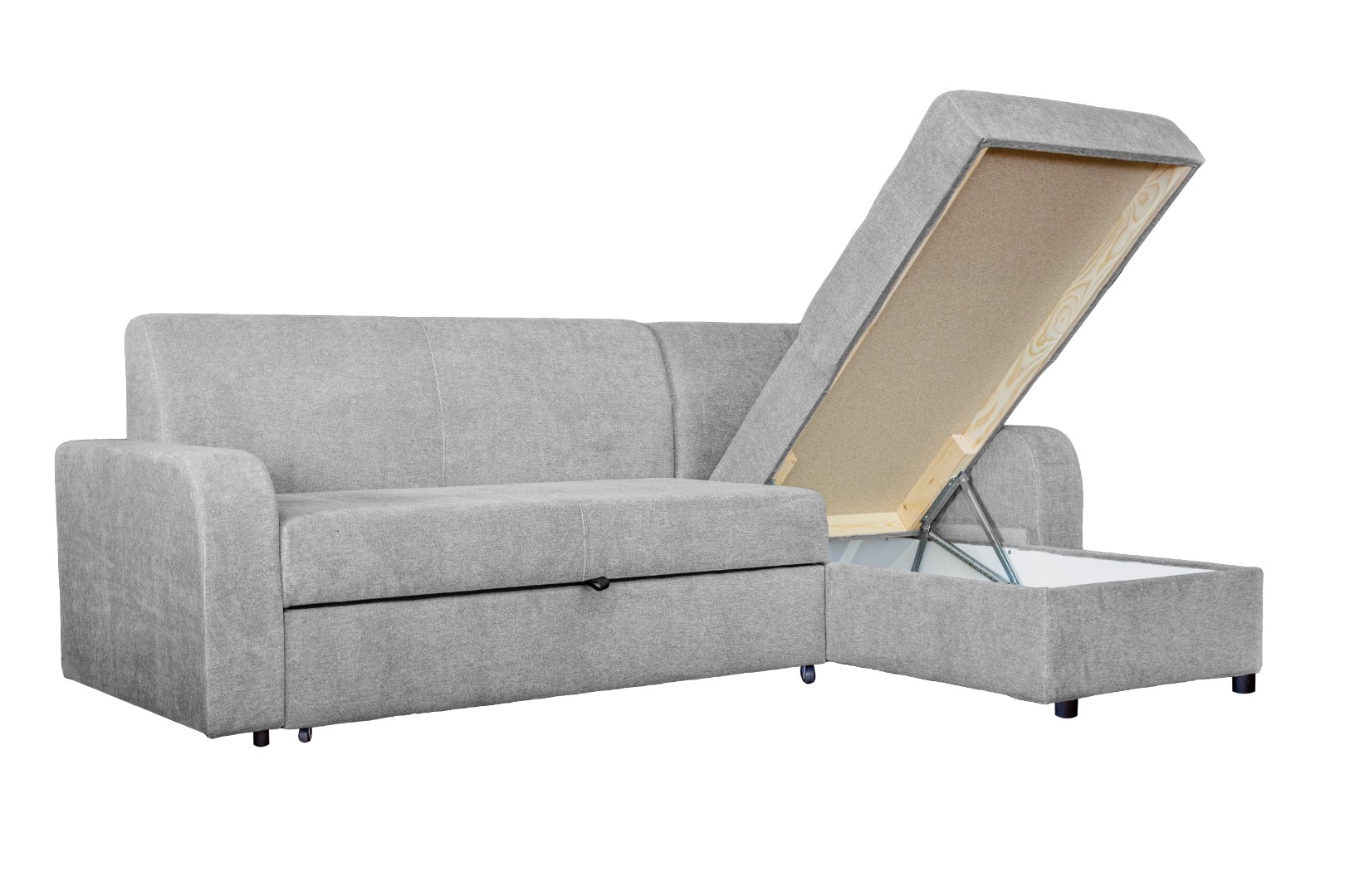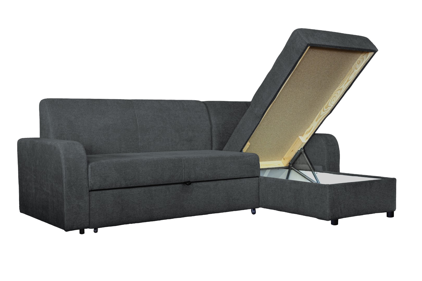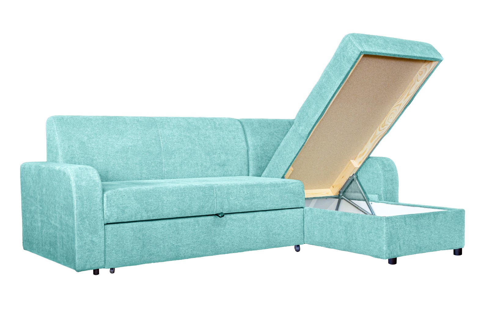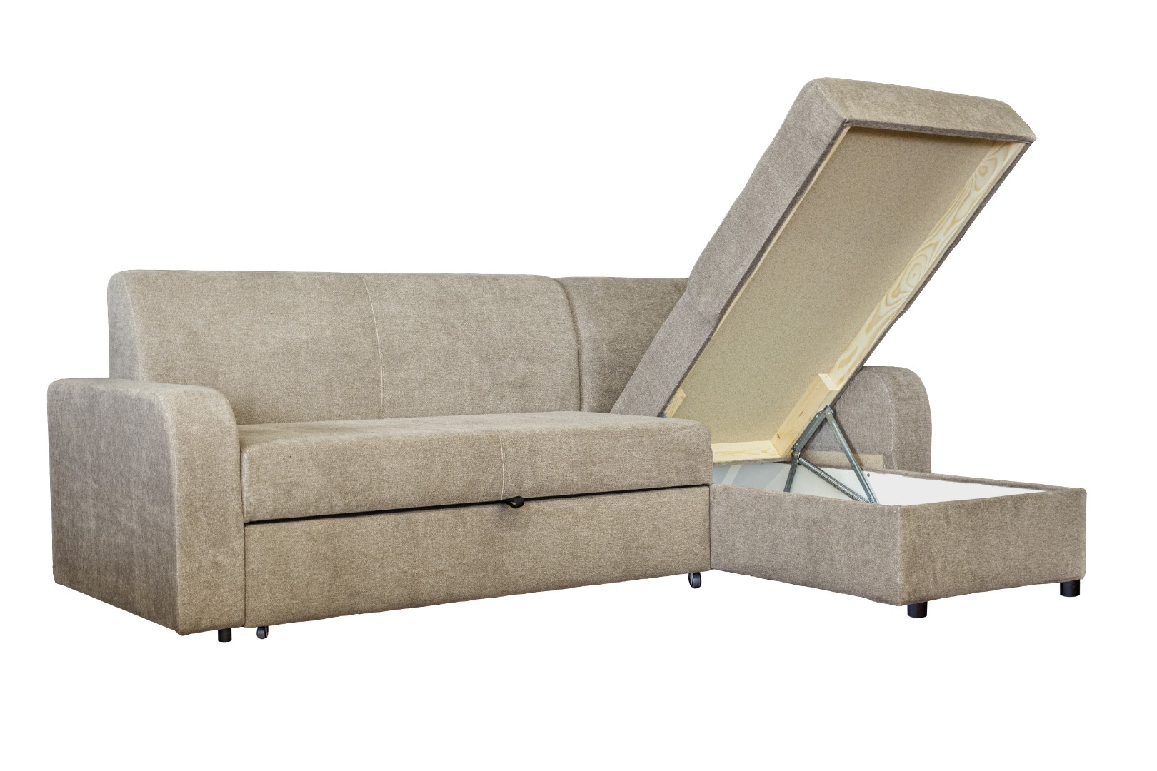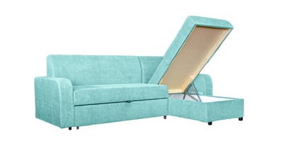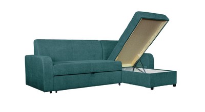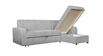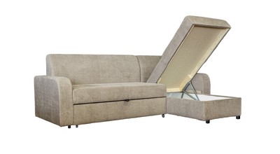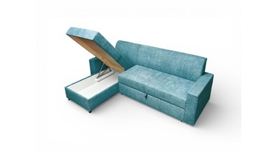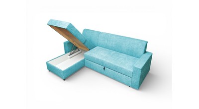 Вместительный ящик для спальных принадлежностей расположен под угловой частью дивана. Доступ к ящику обеспечивает подъемный механизм.