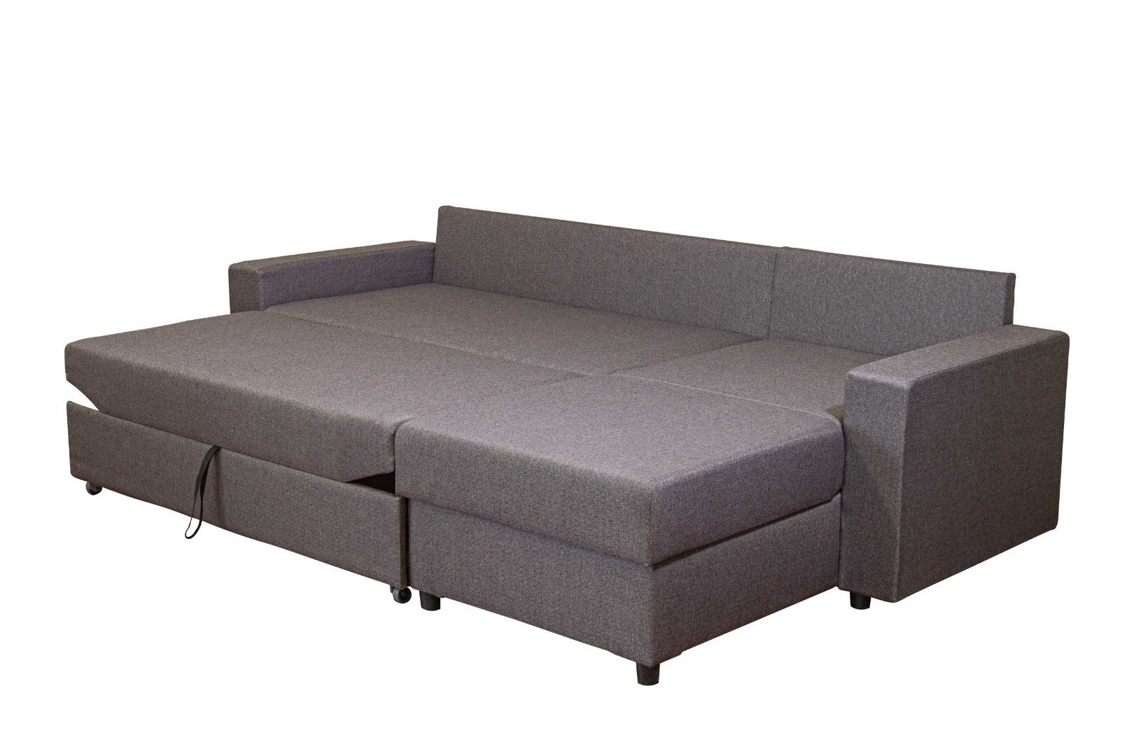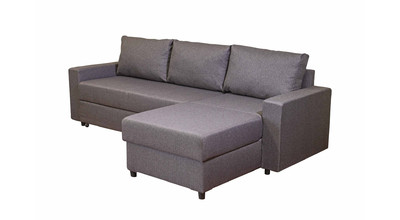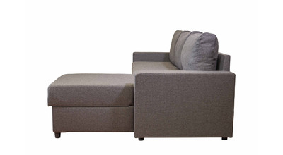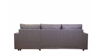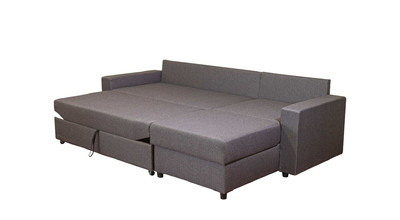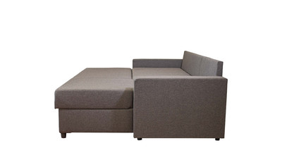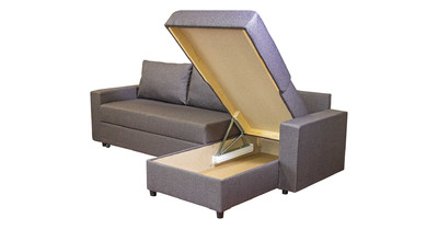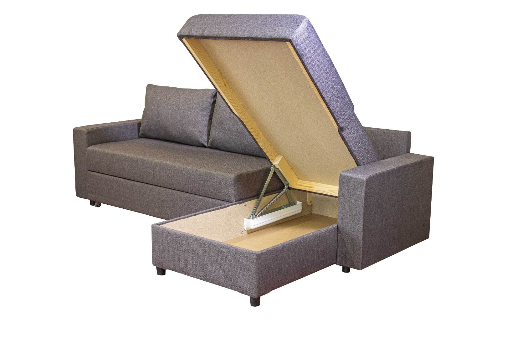Вместительный ящик для спальных принадлежностей расположен под угловой частью дивана. Доступ к ящику обеспечивает подъемный механизм. У дивана на ППУ ящик для белья больше, что позволяет оптимизировать упаковку дивана: свободно помещаются 3 подушки+ спинка от угловой части.