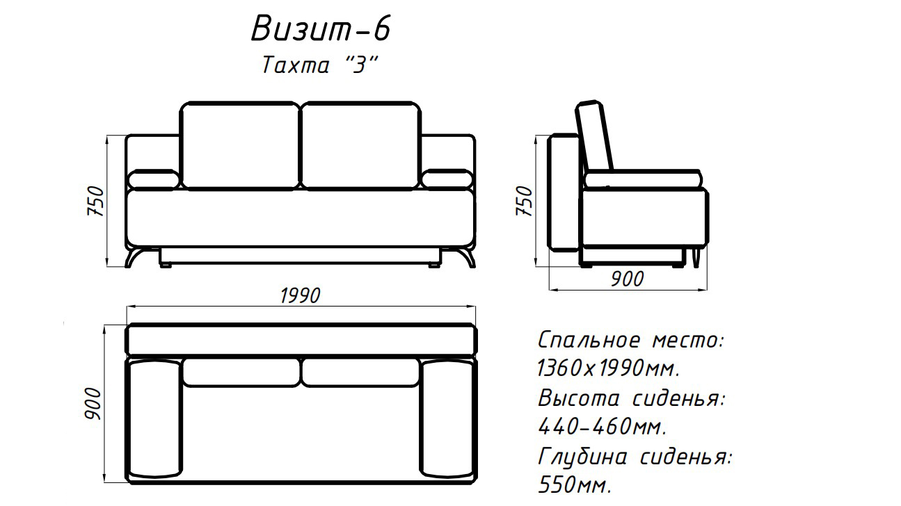 Прочность каркаса обеспечивает использование сухого бруса хвойных пород и ДСП. Наличие вместительного ящика для спальных принадлежностей позволяет экономить место, используя «Визит-6» как гостевой диван или как постоянное спальное место. Площадь тахты полностью используется под спальное место. Спальное место-умеренно жесткое. Наполнение — классический пружинный блок Боннель, специальная термическая обработка пружин, придающая им повышенную упругость, значительно продлевают срок службы матраса, служит в среднем не менее 15 лет.Механизм трансформации – современное изобретение мебельной индустрии - «Тик-так» (шагающий), просто и мгновенно преобразует тахту в ровное и комфортное спальное место, равное двуспальной кровати, превосходно подходит в качестве каждодневного использования, конструкция проста в применении и при этом прочна и надежна, а период её службы необычайно велик.