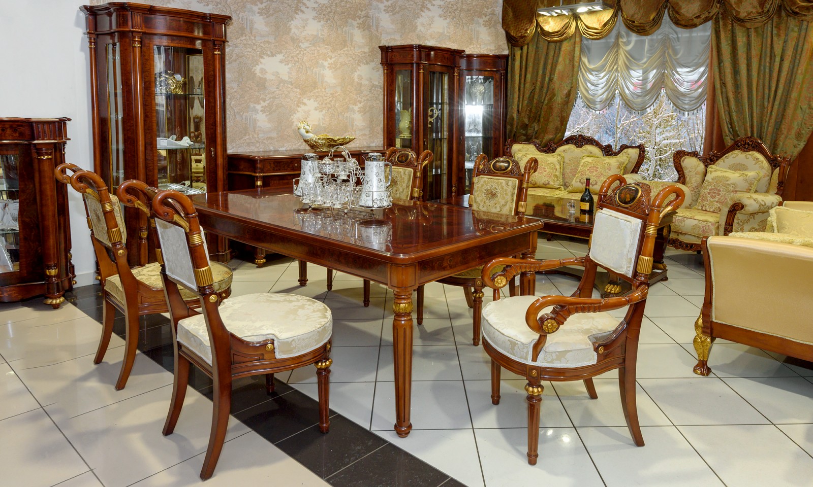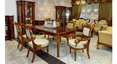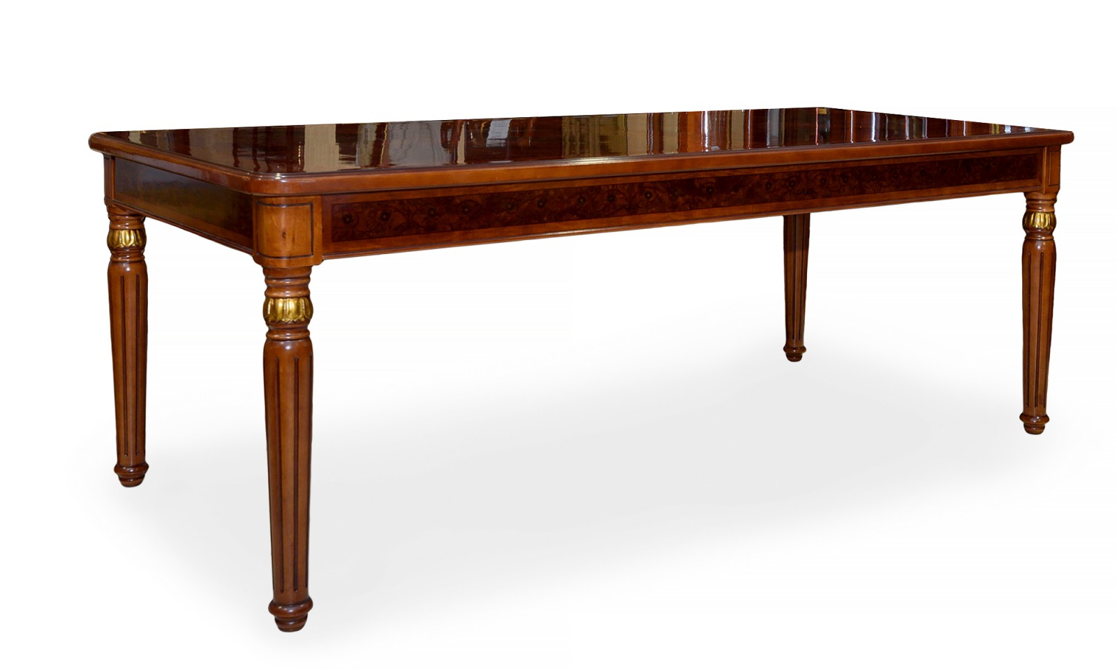 Стол обед. 6688.310.1 получила название «Аристократическое величие». И это не напрасно – все элементы. Стола имеют элегантную форму, благородный цвет, изысканную фурнитуру, восхитительный декор, образованный шпоном из массива разных пород благородной древесины. Такой стол подойдет человеку высокого статуса с искушенным аристократическим вкусом.