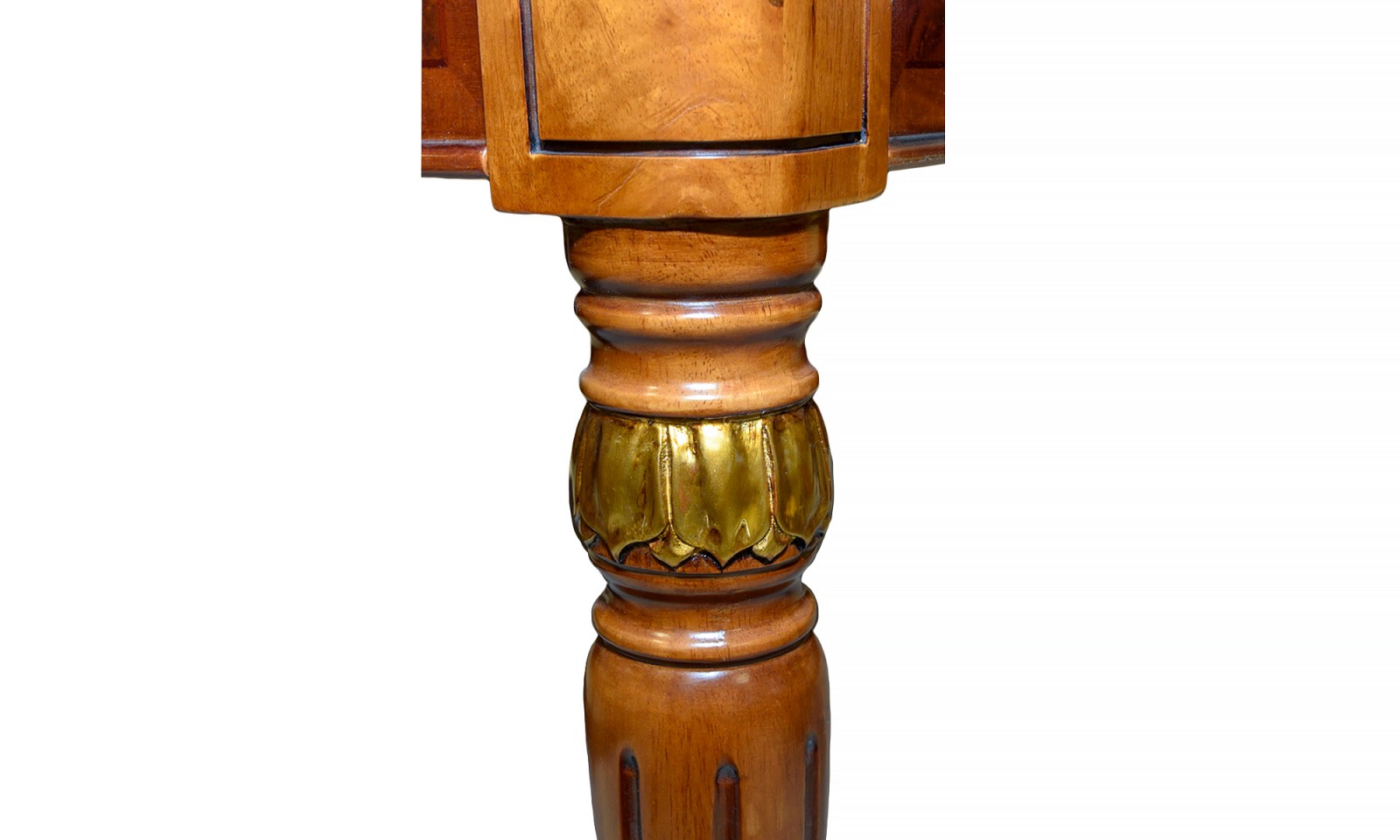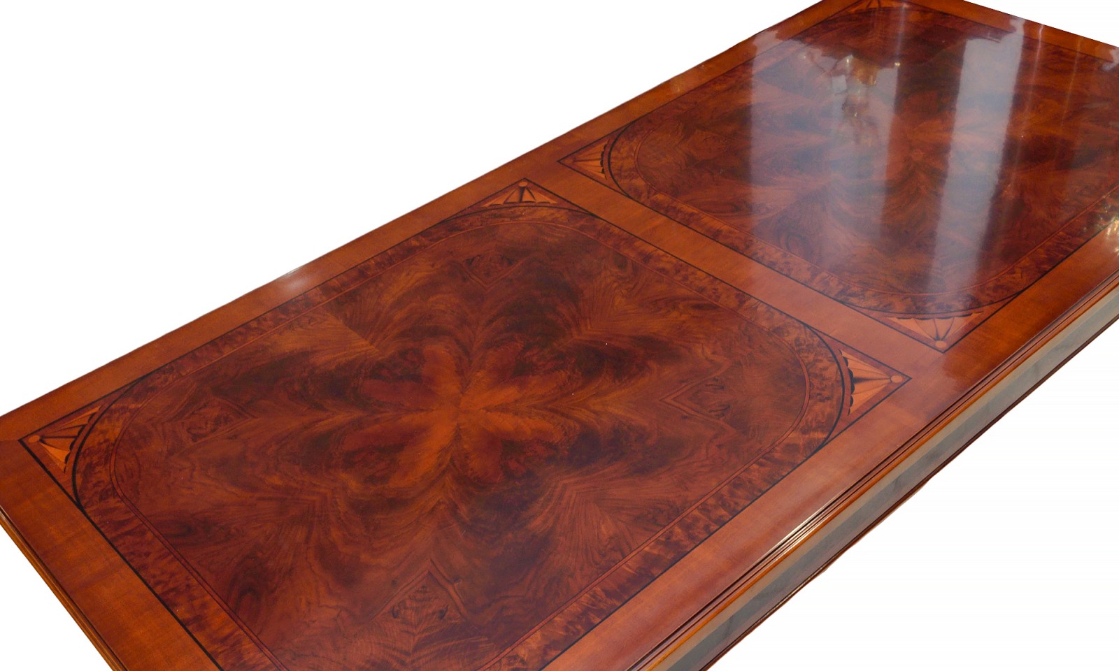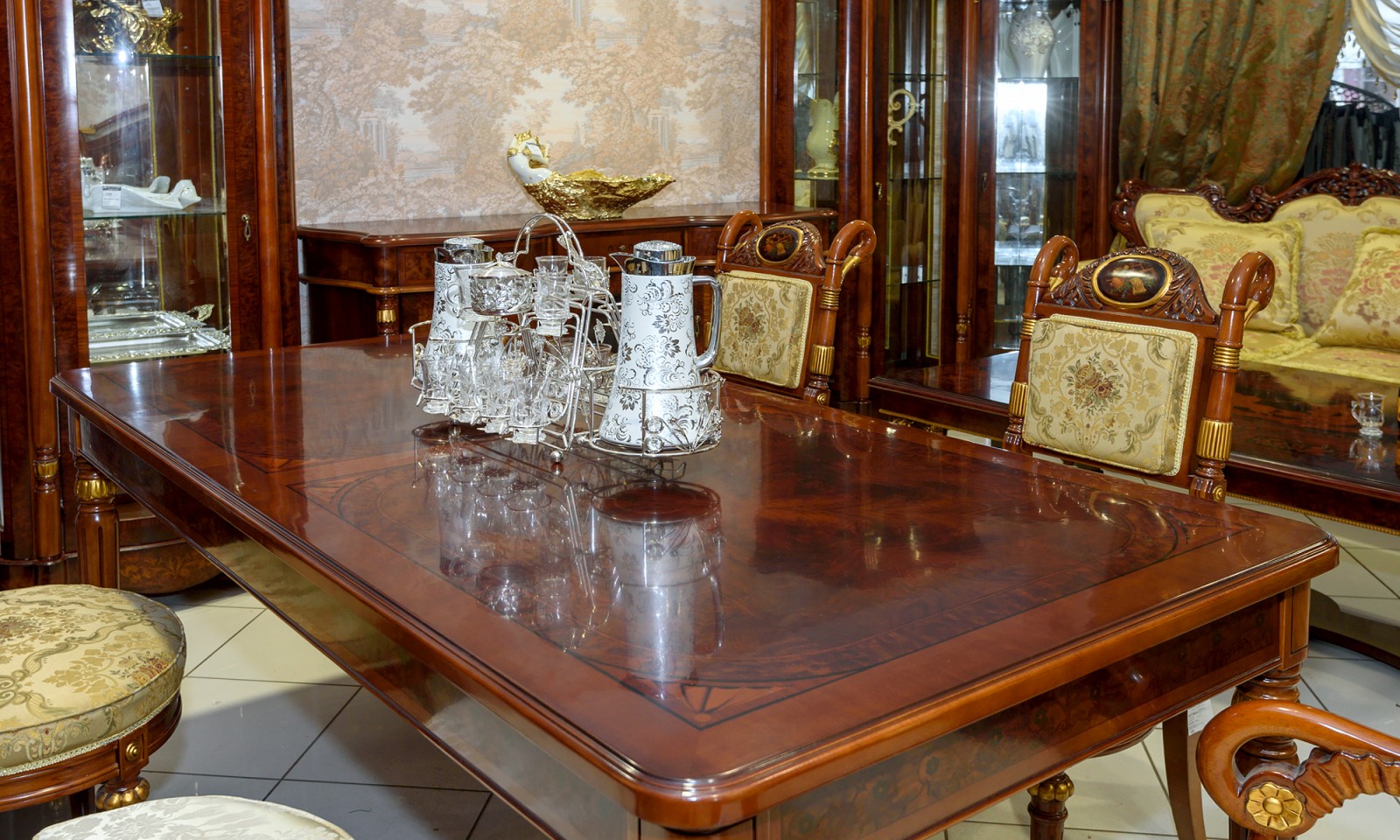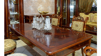 Несущие элементы изготовлены из массива карельской берёзы, а в отделке сочетается шпон различных пород (олива, вишня, вяз, грецкий орех). Мебель стол 6688 имеет элегантную форму, насыщенный богатый цвет, шикарный декор, образованный шпоном из ценных пород древесины.