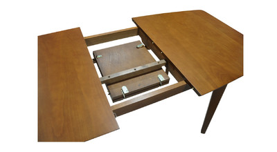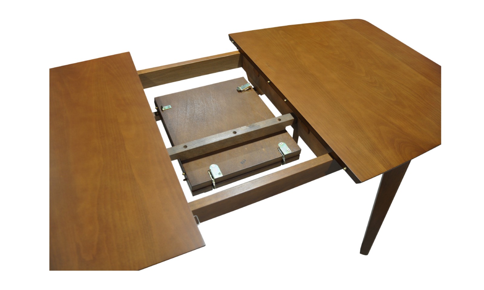 Главное преимущество данной модели – наличие механизма трансформации, который превращает компактное изделие в полноценный обеденный стол. Увеличение рабочей поверхности стола происходит благодаря добавлению дополнительного сегмента, который вставляется в нишу между двумя раздвинутыми половинками столешницы. Добавочная часть находится в специальной нише под основной столешницей, откуда она легко достается в случае необходимости. В разложенном виде он увеличивает свою рабочую поверхность на четверть.